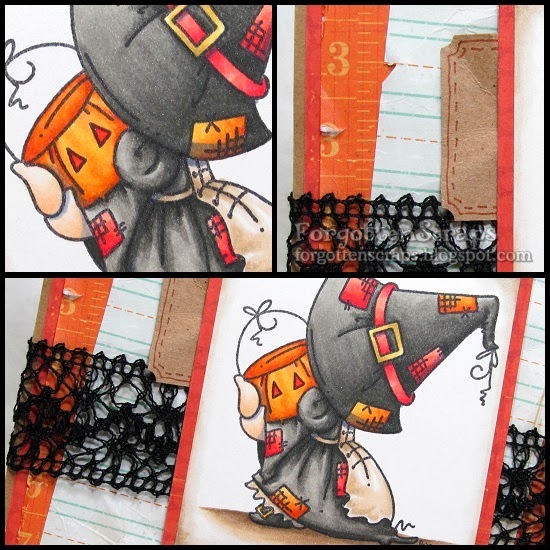 For this project, I used Fancy Sunbonnet Witch from Little Miss Muffet Stamps and kept the layout simple. I was at my Mom’s house and she didn’t have much in the way of Halloween papers so I made do with some red and oranges that worked well together. Then when I got home, I added the black to tie it all in… something about orange and black that just screams “Halloween!” Right?!