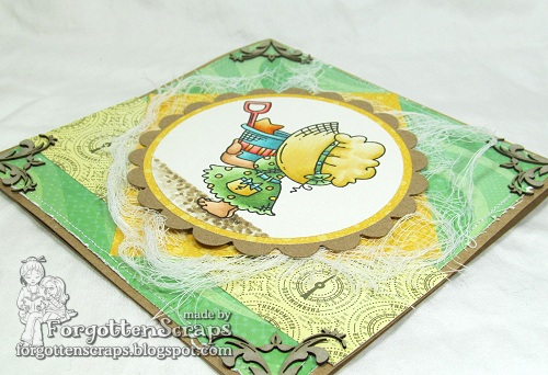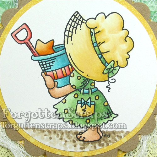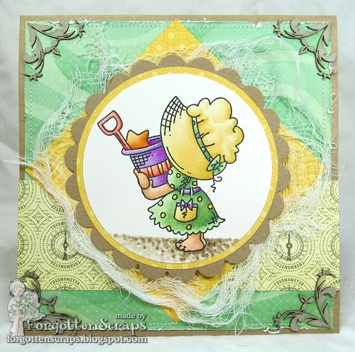 This is my project and I’ve used Sunbonnet Strawberry Big rubber stamp from Little Miss Muffet Stamps. I thought I’d do something different and bring back some black and white; however, these images are adorable in pinks or reds!! I’ve already colored the others up but this was the only one I have on a card. 😛 The flowers have been in my stash for a long time but I’ve found that a touch of yellow puff paint brings them back to life!
