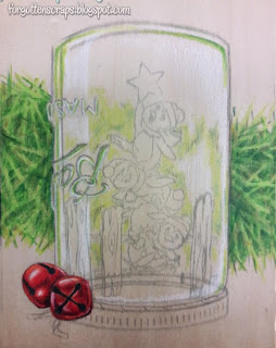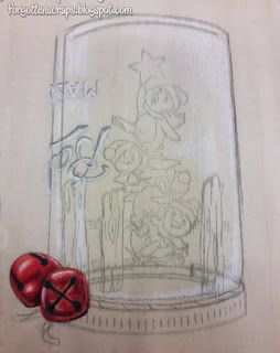 STEP 3: If just the jar wasn’t enough, I sketched in some elements too! The words Ball Mason on the partially on the jar and the twine and jingle bells around the lid. This will help me bring in some color from outside of the snow globe. This will be the challenging part to figure out how those colors will reflect in the jar.