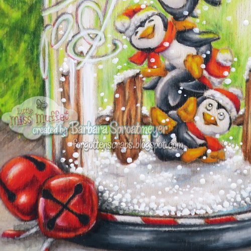 STEP 8: Below I finished the hats with white trim and then the penguins in black and white. I thought I had too much color in the jar’s wording so I tried to add some more white back in.