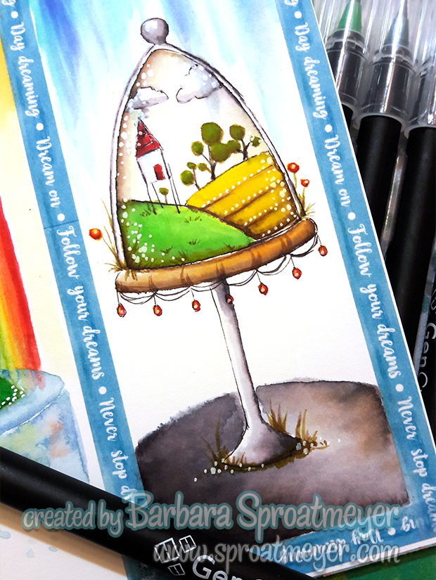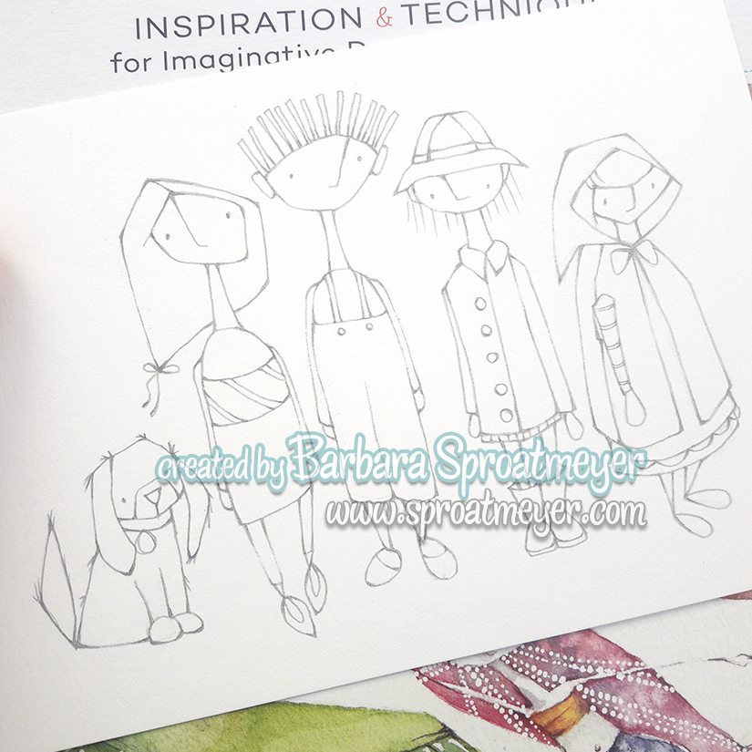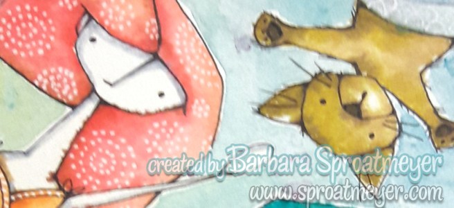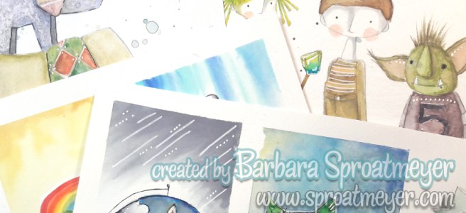Here’s the group of Littles all together. I went back in and fixed the blotch on the troll’s shirt then darkened the lines in some places, used a white gel pen and splattered colored water to finish. I didn’t enjoy working with the Brea Reese Watercolor Creams so I’ll skip those the next time. The rest are still on the table and I’ll try this again with another sheet of Littles.