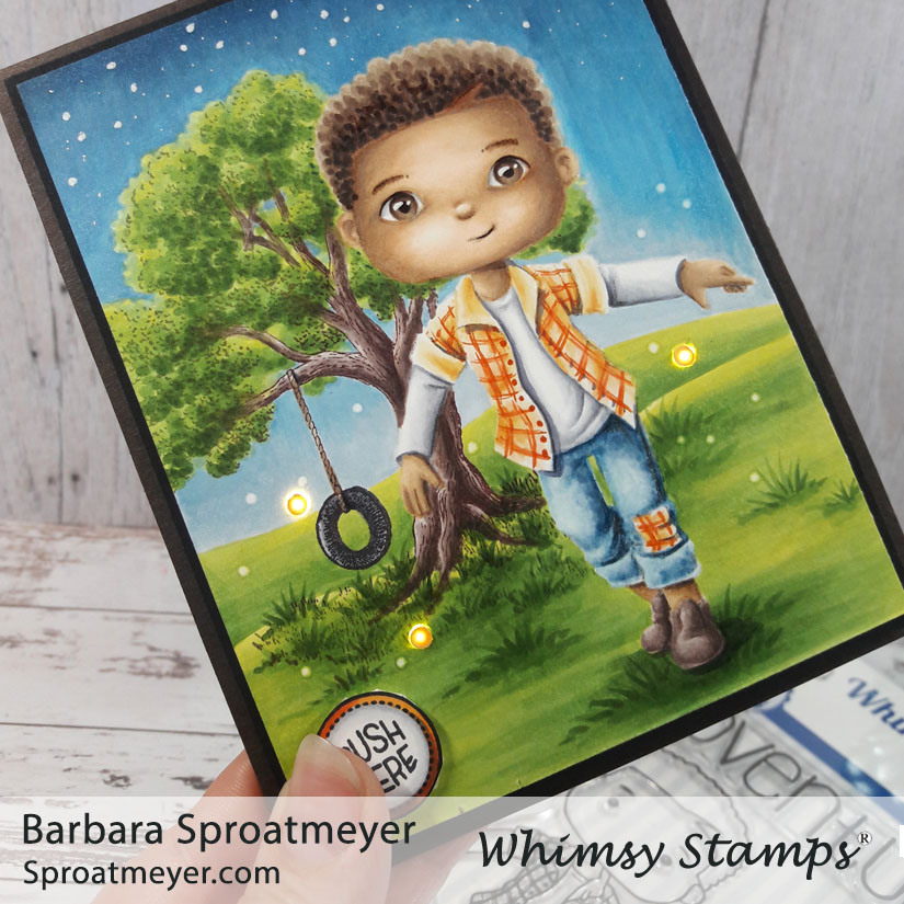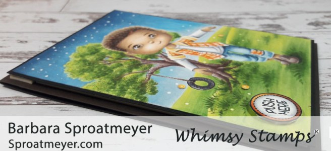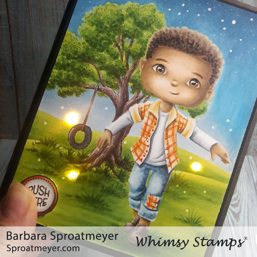 This was a fun project for me that I’ve been working on this week which uses electronics. The scene was created using Polka Dot Pals Raden and Tree Swings from Whimsy Stamps. I then used an EZ Light kit to make this an interactive card.