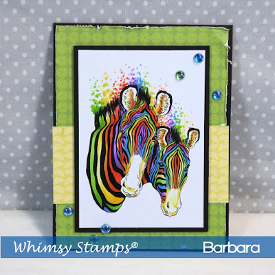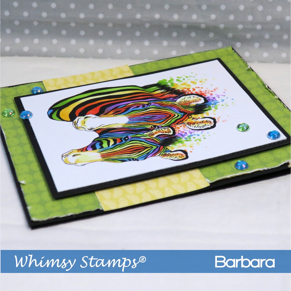 I saw these Zebras and knew I wanted to go for a rainbow theme. This stamp is a DoveArt for Whimsy rubber stamp and even though you might think of zebras being black and white, this stamp is actually very versatile. You can color them any which-way!