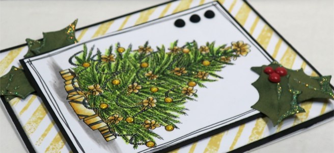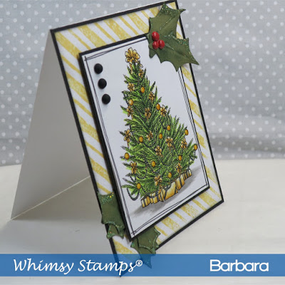 Somewhere I got the idea to make a gold Christmas card and this Christmas Tree stamp seemed to fit the theme. I stamped the background with the Brushed Stripes Background stamp and then built the card up from there. Both of these are fabulous rubber stamps from Whimsy Stamps. The holly leaves were from my stash and I embellished them plus the accessories on the tree with glitter Stickles.