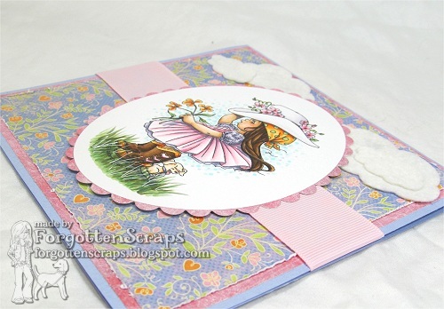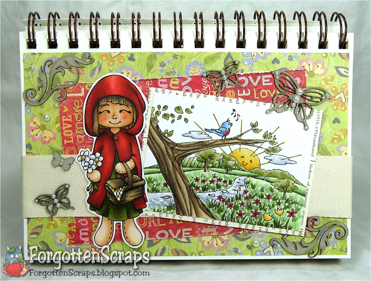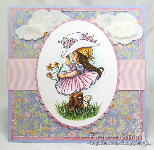 On my project I used “Peppermint as Red Riding Hood” from Little Miss Muffet Stamps and Spring Meadow from Whiff of Joy. What? I know, can you believe I didn’t use a Make it Crafty background this time!! But don’t worry, I made up for it with the chippies. ;D Plus I’ve got to get *some* mileage out of the Spring Kit before it collects too much dust. LOL
