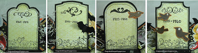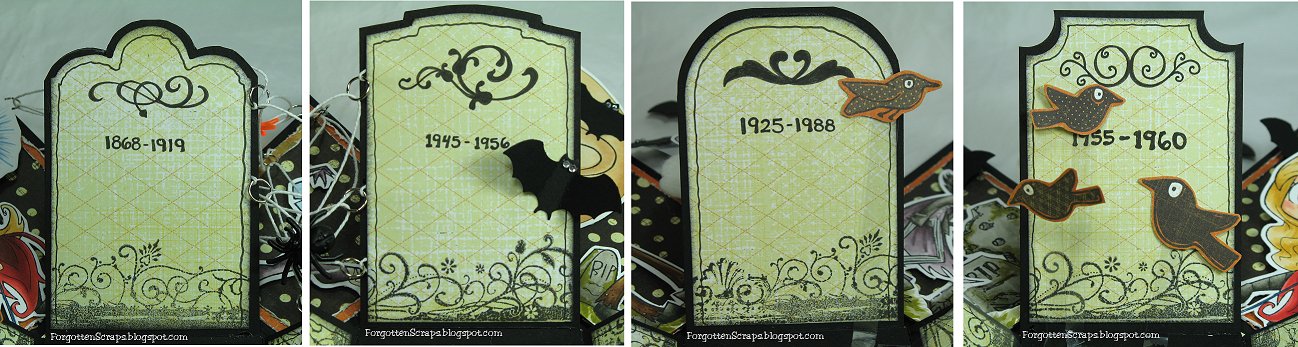 There is so much detail to go over so I divided up the pictures into groups. This first set shows the inner box walls that surround the pumpkin patch. Each gravestone flourish and dates were drawn by hand and I used a border stamps to fill in the bottom. Metal tags or circle punches were used to get the shapes.
