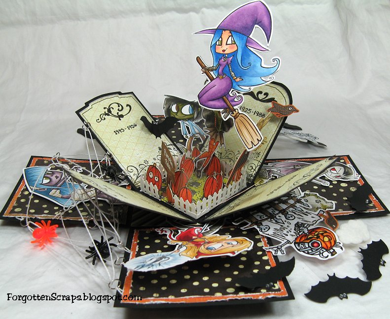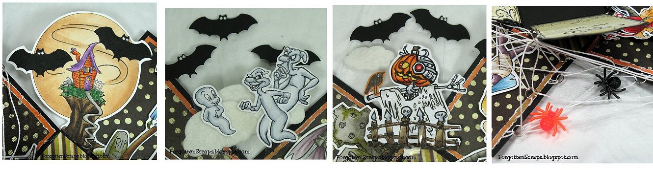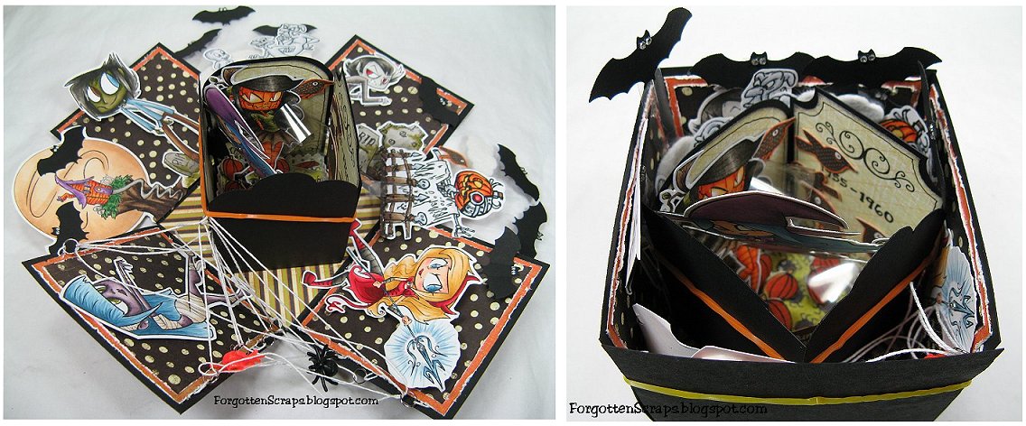 Looking at the open box from the top shows most of the details. I attached Betty Witch in the center so that she actually pops up when the box opens. The rest of the tabs gently fall down provided the spiders don’t get tangled.