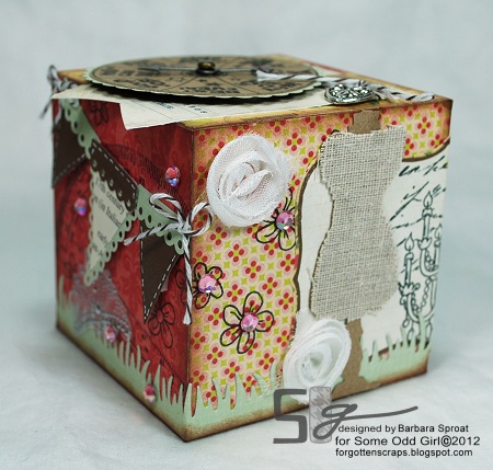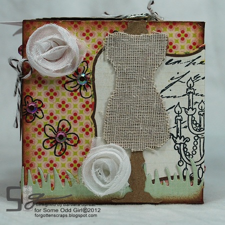 The side that the label spins over on I added more details and also used the daisy accessory stamps that come with Renew from Some Odd Girl. Then I used a couple more diecuts including the grass and dress form which I covered with burlap linen fabric. This side was basically finished except I had two ribbon roses left over and couldn’t let them go to waste. The grass diecut was just the right size to wrap around the other side of the block so I thought why not?!