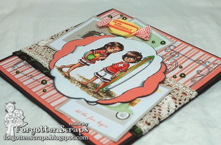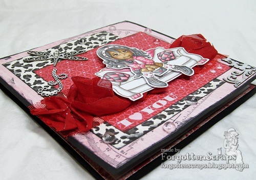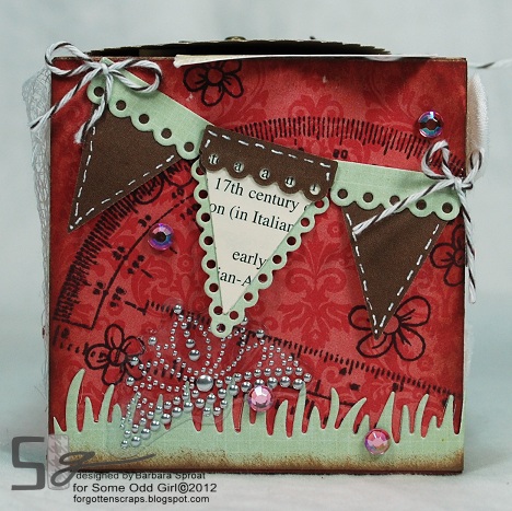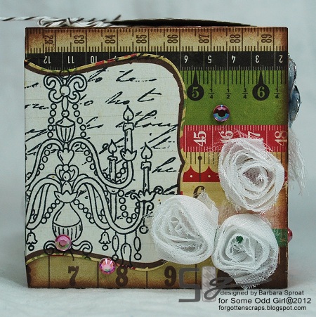 On one of the sides I stamped a label with the Chandelier from Stampavie then wrapped the label around the corner to spill over on the other side. This side uses a busy decorative paper and I wanted rulers to show so I tried not to cover them up too much and added some ribbon roses and a few sparkling gems.