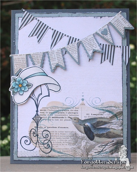 This is a project I made over at my Mom’s house the other day and it was fun to spend a little time with her. I wanted something quick so I decided to use the Hatter Hats and Hatter Hat Stands to make a card. Then decided it would be perfect to use the new Party Banner from Little Miss Muffet Stamps too and that’s how it all came together. So simple and I love how it turned out.