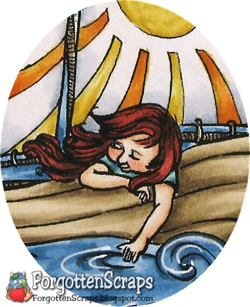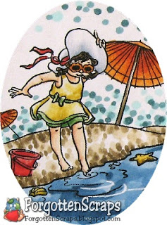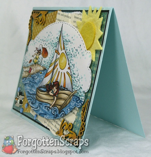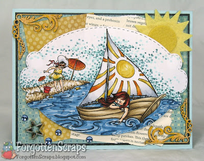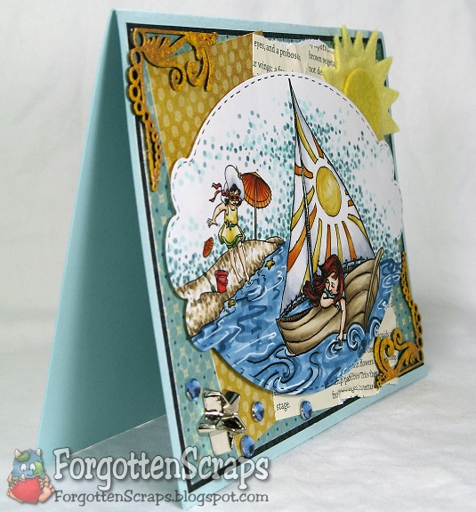 Finding a color scheme that works for the beach and is also inspiring to me has been a challenge. On this card, however, I scrapped the ideas that I had to use themed paper and went with a traditional floral, of all things. ;D But it had the colors I wanted and was covered up enough to look like interesting swirls. Yep, those are swirls… NOT flowers! He he he