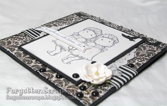 I cut one of the paper sheets down for the frame she is in. That took a little finesse but I think it was worth the outcome. Then I stamped and colored the Knife and Fork stamp (from Magnolia) for her to sit on. The leaf embellishments were fun to created too – I used a leaf punch and colored them with Copic markers to match. I punched them in the same paper I used to color Cheeky Cherry Pie so the coloring blinded well.