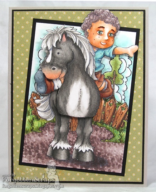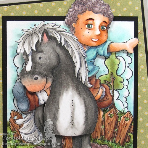 This is Cheeky Cherry Pie from The Greeting Farm and I thought she would be a perfect November project with her yummy baked pie. I wanted a harvest theme so I chose papers from We R Memory Keeper that had a good color autumn theme. However, I didn’t want everything to be browns and yellows so I added some green for a splash of color. And what color of hair goes best with green? Well, red hair of course!