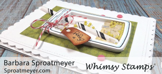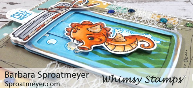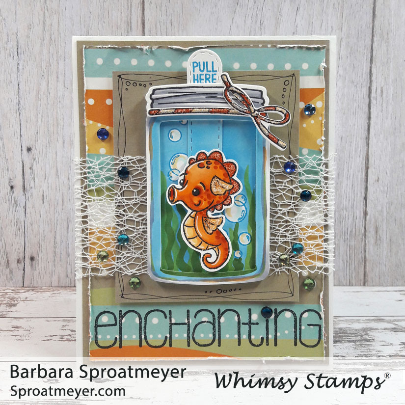 One great set from Whimsy Stamps to coordinate with the Mason Atlas Jar die set are the Baby Sea Creatures. So cute!! These adorable creatures work well in the larger Mason Jar rubber stamp too and it’s so much fun to play around with. I used a few other things and made this interactive card.