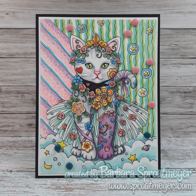 For something slightly different, instead of coloring a stamp, I decided to color a coloring page. This is the title page from the Creative Kittens coloring book by Marjorie Sarnat. That included just the kitten so to fill out the rest of the card, I doodles the clouds and background.