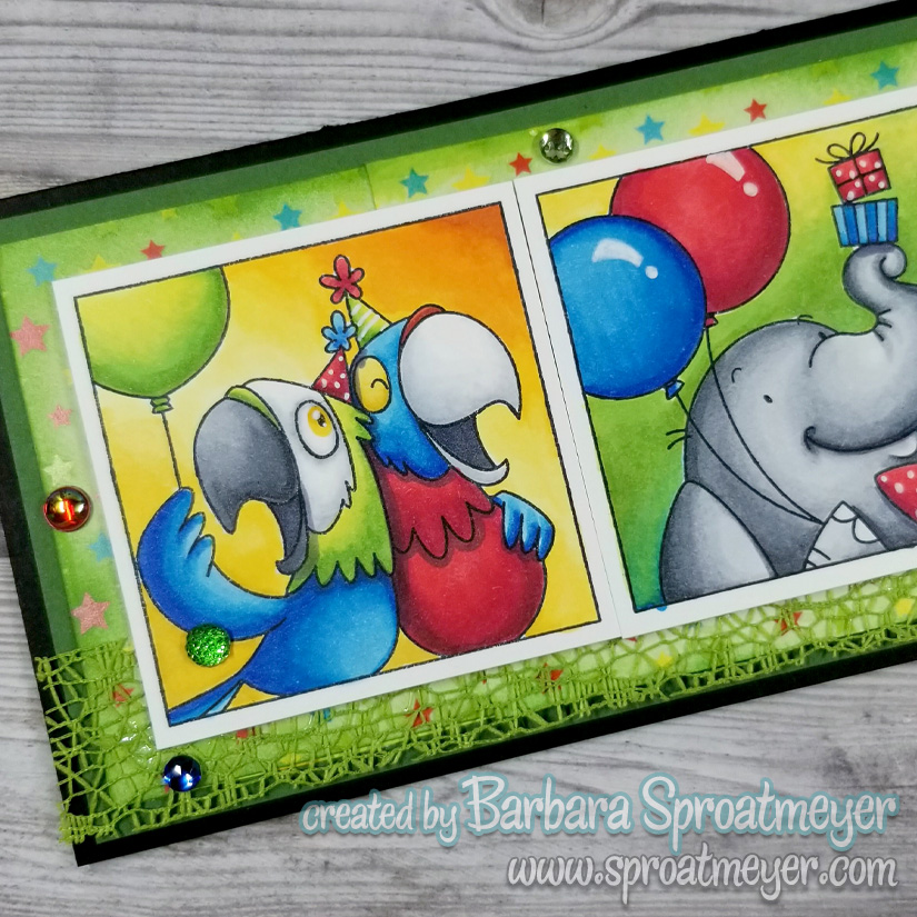 I started this card by first stamping all the characters from the Picture Perfect Party Animals set from My Favorite Things. I then colored them using the same bold and bright colors throughout each panel. I made sure to color two with a yellow/orange background, two with yellow/green and the last two with a blue/purple background. This is the only time I used purple and I hope it gave the card a zany twist.After the images were colored, I selected the sets of three I wanted to use on each card. I knew I was going to slimline cards and three would fit perfectly on each one. You don’t have to have a slimline die to make these cards – just cute the base at 8.5″ x 3.5″ and fold in half. Then I then cut my layered cardstock and used paper from the Birthday Celebration Paper Pack to build the card.To finish off the card, I attached the colored images with foam tape and then added ribbon and gems as embellishments. That’s done! I’ll be showing the other card I made next week.