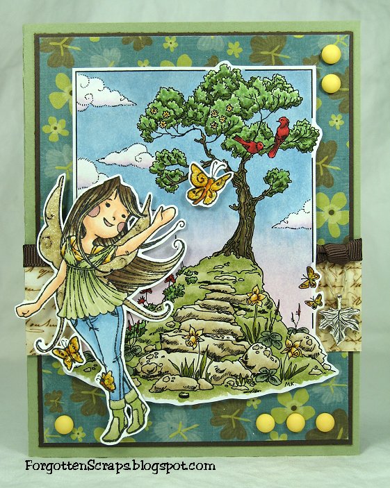 I made this card using Danni from Paper Makeup Stamps and behind it Timber Top Ridge from Make it Crafty. It’s a simple layout but I think it really focuses on the two images equally. I added a touch of yellow to help keep the focus moving. Click on the images to see it larger and you’ll notice little details like the leaf charm, knot in the ribbon and a touch of glitter.
