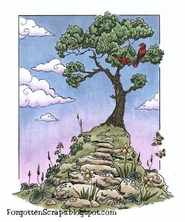 Here’s the complete background featuring the Timber Top Ridge. I wanted to capture an evening sunset and blended purple into blues. However, I didn’t catch on to a good technique until towards the end so some of the areas aren’t blended as well. Next time I need to use the blender pen to lay down a wet area then apply the colors which will really help. Anyway, you should really see it colored with cherry blossoms! Check out Zoe’s take – simply stunning!
