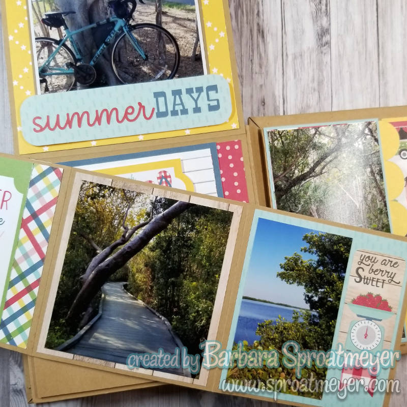 Here’s an inside look at the accordion scrapbook that Tina kitted up at the Paper Nest Dolls retreat in Florida. She put so much work into this project and it turned out great. I ended up putting all my picture in there from the bike rides that I took that weekend while I was in Fort Myers and Sanibel Island. The papers are from Echo Park and the images are from Paper Nest Dolls… colored in my style with creative color placement.