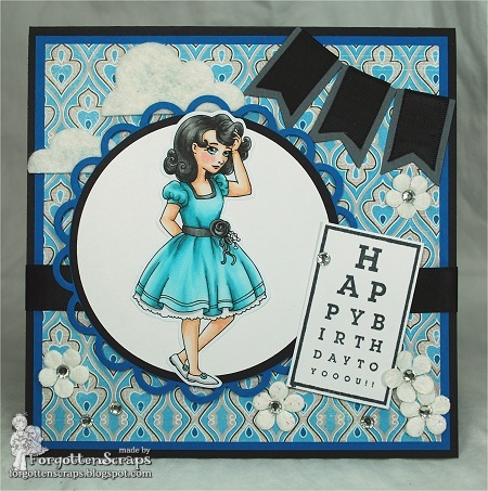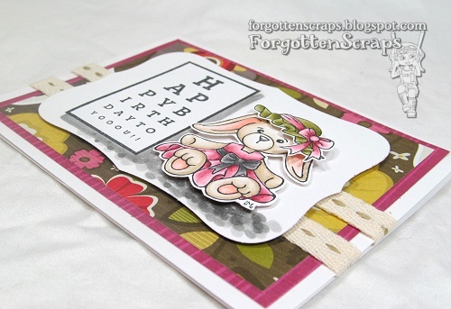 The main image is Birthday Josh from Sparkle Creations Rubber Stamps and the sentiment is I Chart from Penny Black. I kept the layout simple, added a little ribbon for a tag, a chippie from Make it Crafty and finally went around the edges with a white gel pen. I colored the images using Copic Colors from the “E”arth and “C”ool Gray markers.