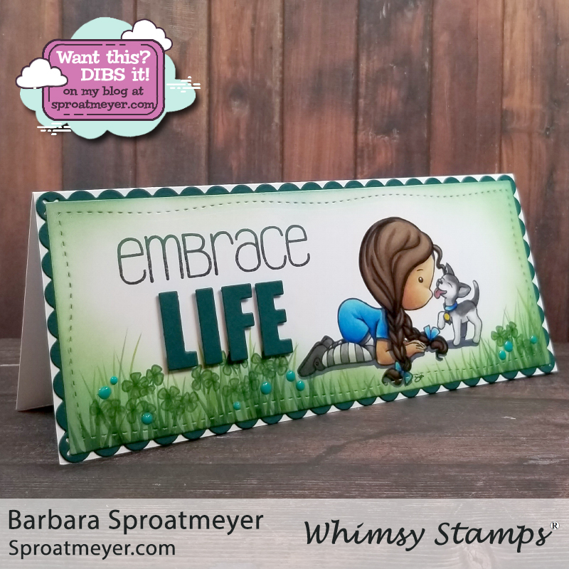 Winner announced below and another chance to dibs a card. This one is also using the new Polka Dot Pals Brianna from Whimsy Stamps along with a few slimline dies to create this fun holiday card. It also has a wobble component. Ooh aah! Read below for giveaway details and continue reading for more details on how this card was created using these featured products: