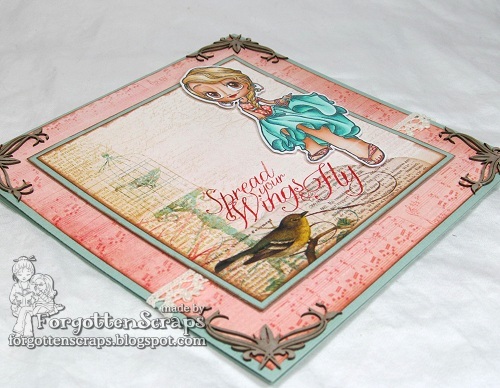 I didn’t want to color a full background so I used the dot technique with various light blue colors. I think this helps to distinguish the image from the background and also added a little more color to the center. Finally, I finished up the card with layers, stitching and accessories!