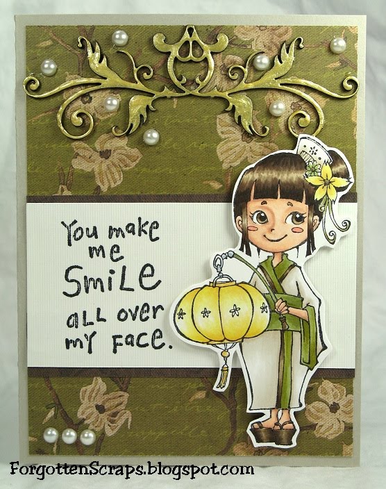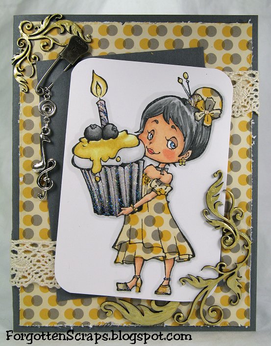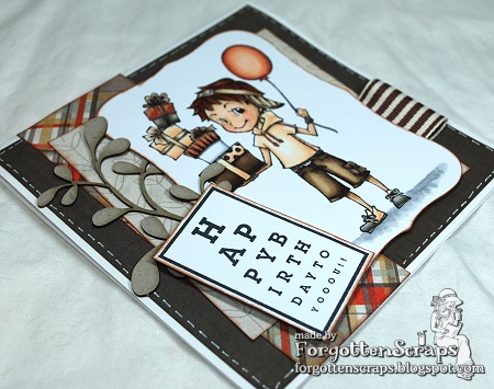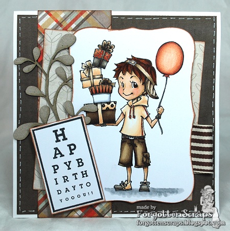 The main image is Birthday Josh from Sparkle Creations Rubber Stamps and the sentiment is I Chart from Penny Black. I kept the layout simple, added a little ribbon for a tag, a chippie from Make it Crafty and finally went around the edges with a white gel pen. I colored the images using Copic Colors from the “E”arth and “C”ool Gray markers.