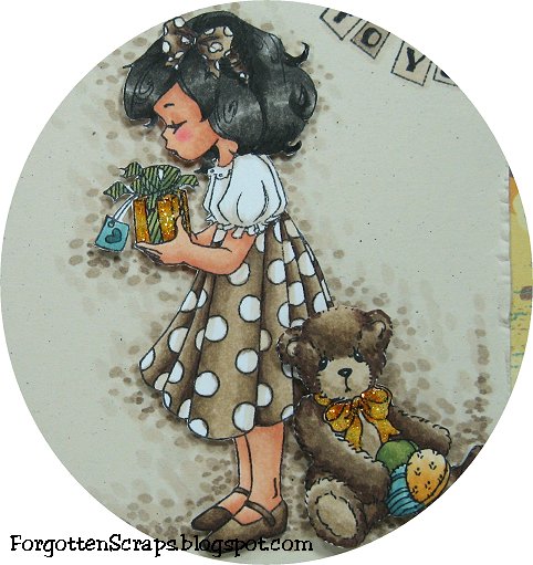 I made this card using A Gift for You from Sugar Nellie Stamps plus a bear from P. Hillman. I saw a wonderful card created by Kim (PaperBabe) and had to try one out, so that is how this layout came about. I also colored the dress following the Color Copic Me coloring clothes tutorial and used fall colors for the Teddy challenge.