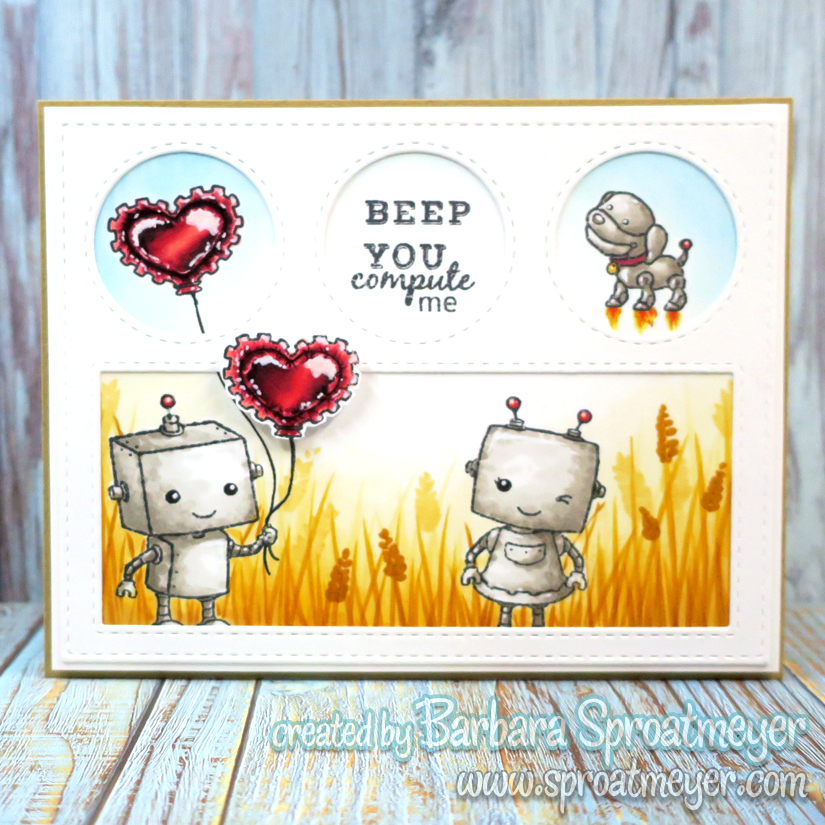 Here’s a valentine I made which features an out of season theme. I think valentines can be given throughout the year and it’s nice to be able to make some that aren’t all pink and red. This one features two robots from SugarPea Designs and assembled in a Peekaboo Window frame.
