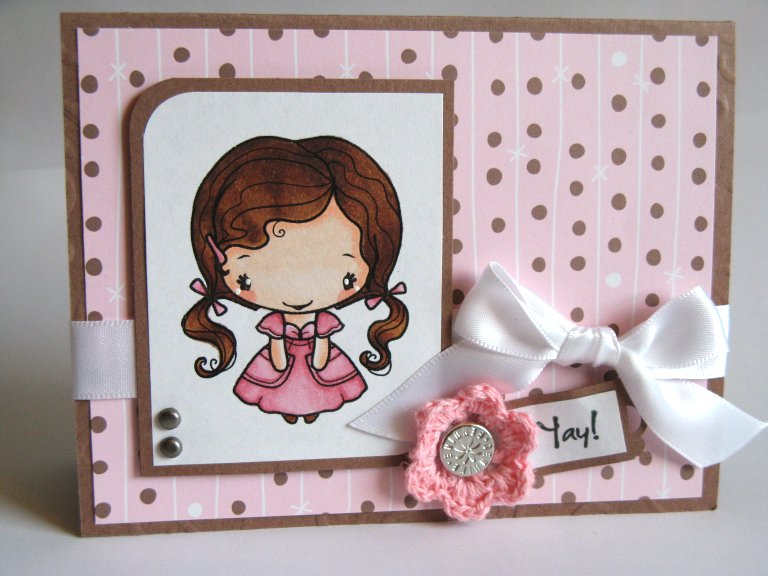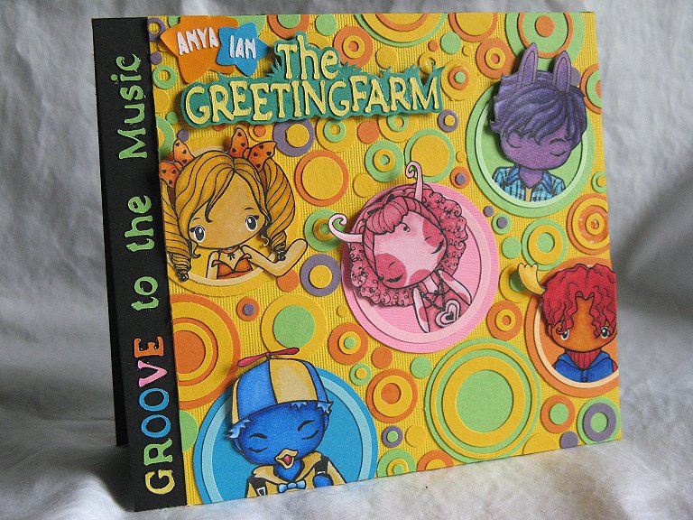The challenge is to design a card, layout, or altered item based on your favorite musical artist, icon, or band. My card was inspired by my favorite… opps, I mean my kids’ favorite music, The Backyardigans. ;-D Ok, I’ll admit it; they have catchy tunes that seem to go with everything! This card is a bashing of the two themes, The Greeting Farm (TGF) and The Backyardigans. Each image was altered and all the circles and letters were punched or cut then glued individually.