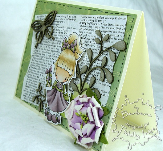 After the class was finished I added the image and chippies to finish the card with an extra touch. The image I used is Annie’s Prezzie from Tiddly Inks and the chippies are from Make it Crafty. I kept with a basic color scheme of the paper then added purple as a coordinating color which also tied in the flower.