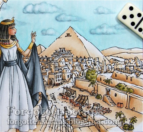 I debated how to color the city and finally decided to color it all the same to look like sun-bleached sand on a dry desert day. Then I added some shadows with BV23 and a little color here and there on the greenery, baskets and market stands. For the most part, the sun is shining down from the upper right corner of the image so I could have Cleopatra’s face stand out more. This was a different spot from where I normally put the sun (upper left) so there are a few mistakes – lucky for me, none of them stand out. he he he