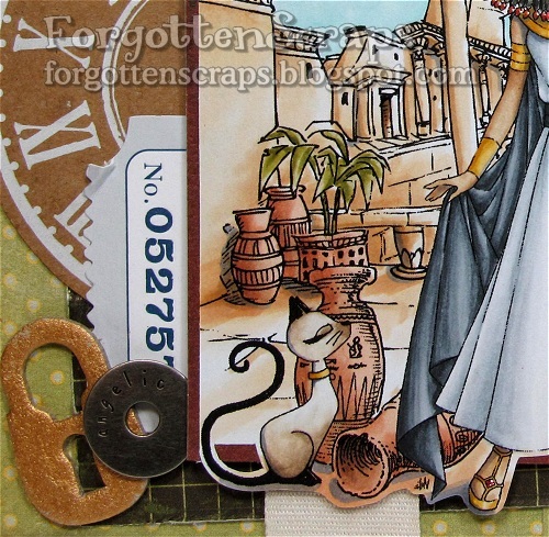 For the card I didn’t want to add too much to distract from the main image so I found a good decorative paper that worked out to take the place of embellishments. Then I added a clock face to fill in an empty space and some ribbon to complete it. Oh, and yes, I had to use the sewing machine around the border too. ;D Here’s the image up close…