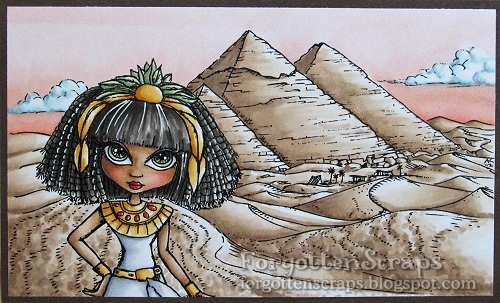 For my project I merged together Jackie and Jackal from Tiddly Inks with the Egyptian Pyramids in the background from Make it Crafty. I brought Jackie up into the foreground because I really wanted to focus on her and get some details colored in her face. Then I also wanted to do something different in the background and settled on a pink sky instead of the traditional blue.