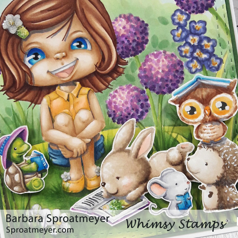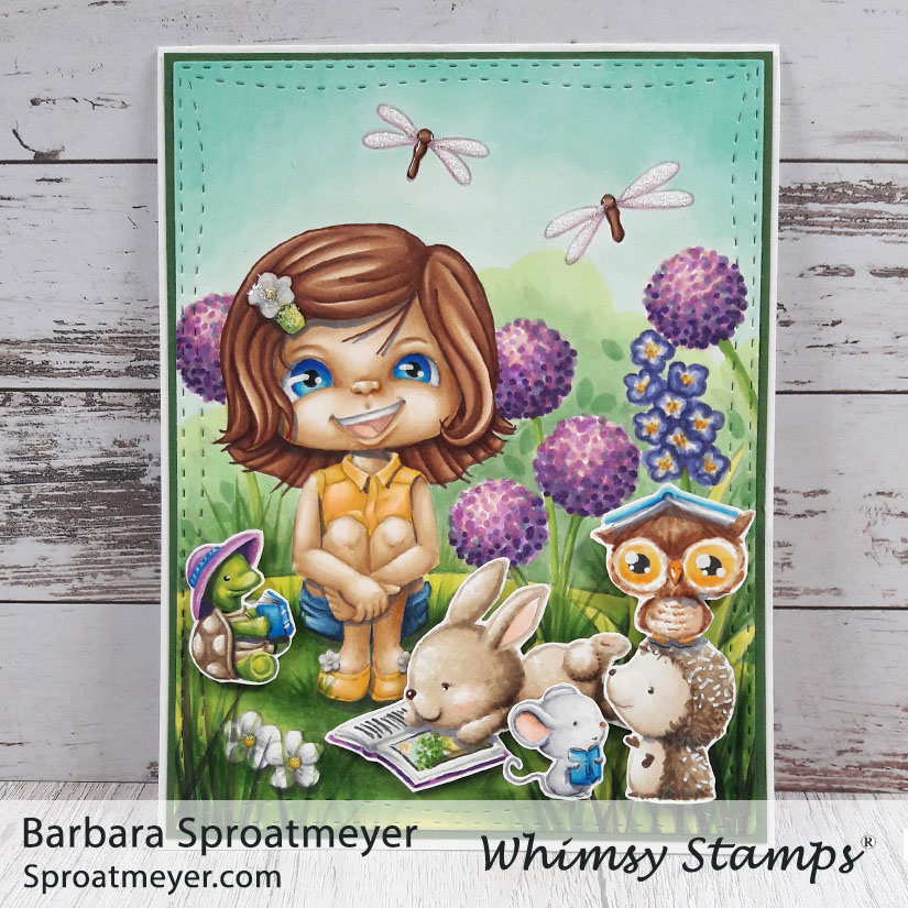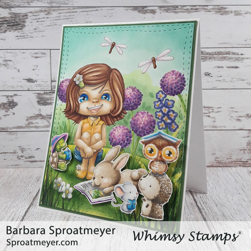 It’s story time! I’m back with an updated version of this digital coloring scene. This is Polka Dot Pals Brooke Reflecting Scene from Whimsy Stamps and I added a bunch of critters from Purple Onion Designs.