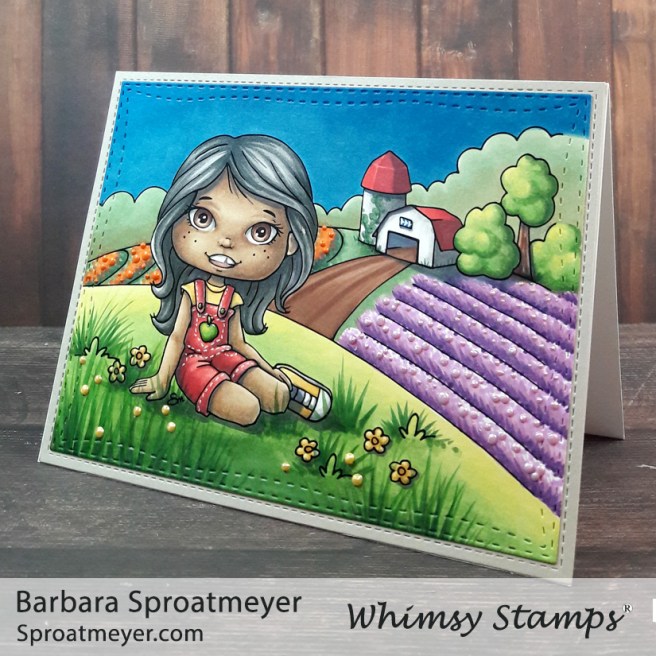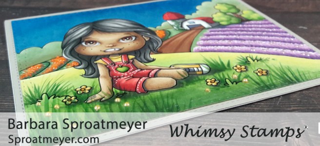 It’s a release day at Whimsy Stamps and you’ll want to head on over there to grab your newest Polka Dot Pals clear set! This is Polka Dot Pals Vera and I can’t wait to see how everyone colors her up or color up the houses in the background too. For my card, I stuck within the set and created this scene…