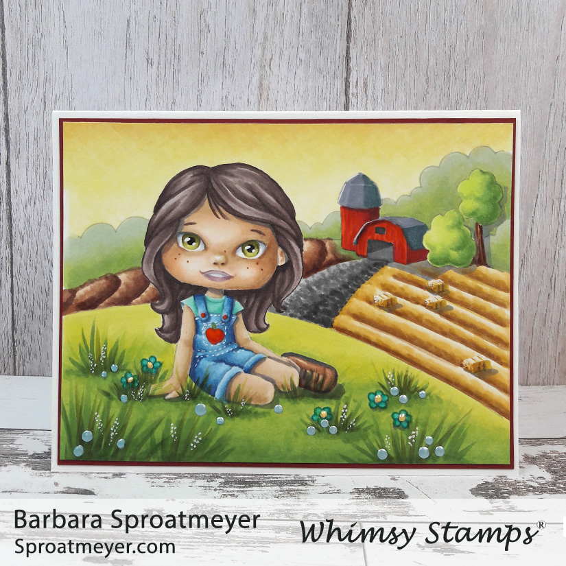 Sometimes not knowing what to color next, I look to my desk for inspiration. Or rather, I’m too lazy to look elsewhere and grab the closest thing… in this case, it was my second printing of the digital scene Polka Dot Pals Jayden Farm Break. I thought, sure why not! And this time I was going to do it different.